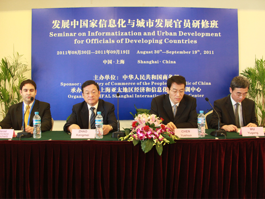 继7月底由国家商务部主办、上海亚太地区经济和信息化人才培训中心(以下简称上海亚太培训中心)承办的2011年第一期援外官员研修班——《发展中国家信息化发展官员研修班》顺利结束后,上海亚太培训中心工作人员不辞辛劳,发扬忘我的工作精神,经过精心策划,认真准备,由国家商务部主办、上海亚太培训中心实施承办的为期三周的2011年第二期援外官员研修班——《发展中国家信息化与城市发展官员研修班》于2011年8月30日在上海凯博佳豪酒店顺利开学,开学典礼上午在酒店会议厅隆重举行。