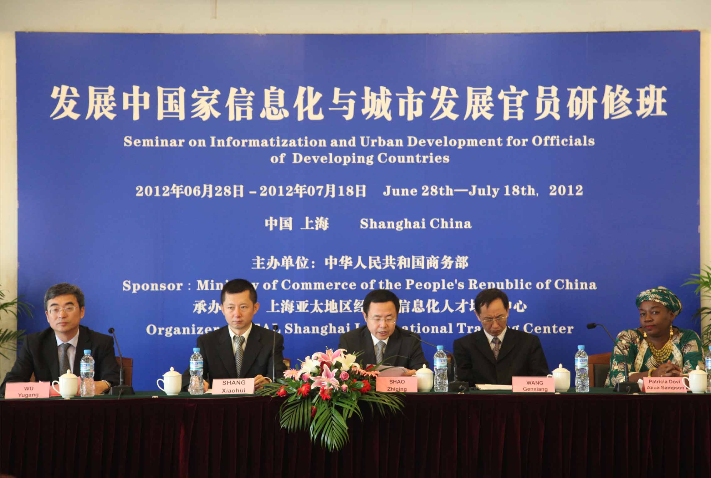继2012年首期援外培训班——《发展中国家信息技术应用培训班》6月初顺利结束后,由国家商务部主办,上海亚太地区经济和信息化人才培训中心(以下简称上海亚太培训中心)承办的为期三周的2012年第二期援外培训班—— “发展中国家信息化与城市发展官员研修班”,在全体学员和工作人员的共同努力下,圆满完成各项议程,7月18日又在上海顺利结束,结业典礼上午在上海凯博佳豪酒店宴会厅隆重举行。